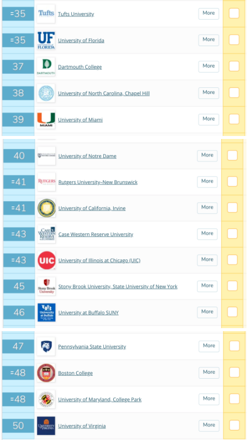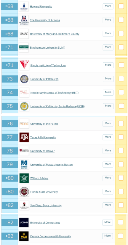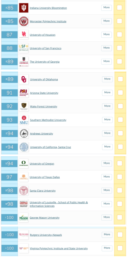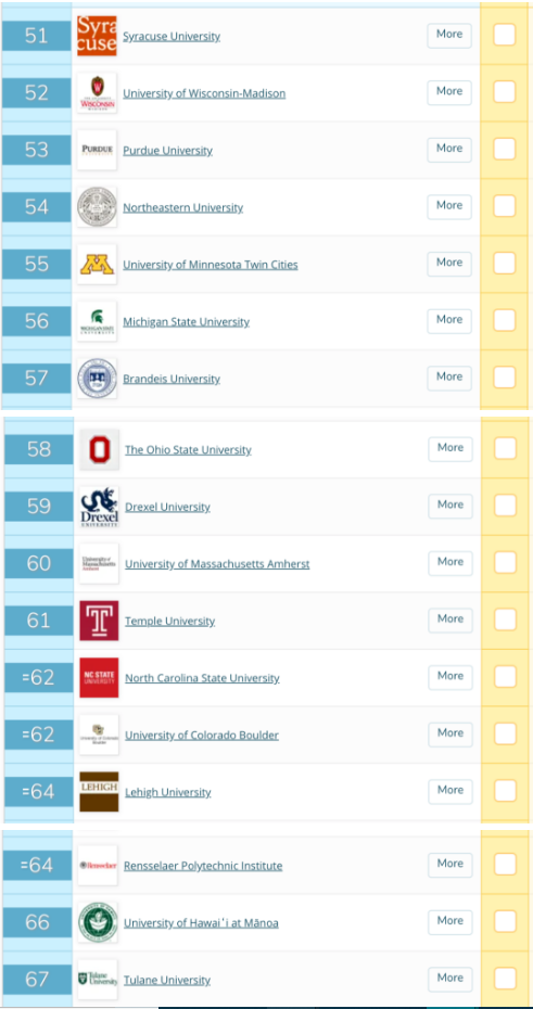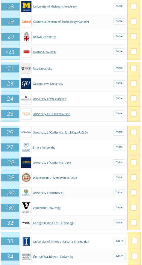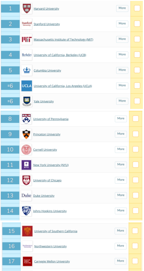 哈佛大學、斯坦福大學、MIT、加州大學伯克利分校、哥倫比亞大學、加州大學洛杉磯分校、耶魯大學、賓夕法尼亞大學、普林斯頓大學、康奈爾大學