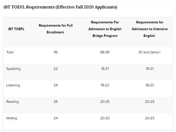 4. 學校嚴格要求國際生的英語水平,低于最低分的不允許入學(沒有“有條件錄取”)。學校只接收托福成績,最低分為85分。CSE表示“不得使用其他英語考試來代替TOEFL”,且接受家考但不接受TOEFL ITP成績。