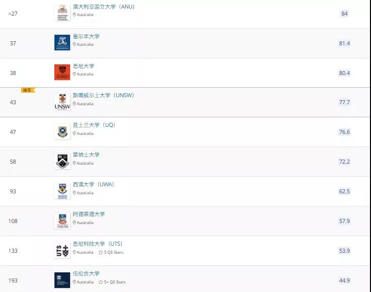 悉尼大學第38名,上升2位,墨爾本大學第37名,上升4位,新南威爾士大學第43名,上升1
