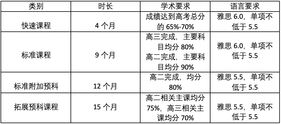 英國預科:通常是標準的一年制,但因學生語言考試成績的層次不齊,學校也在預科之前先開設語言延長課程,如學生的雅思成績不到5.5分,則時間會在1.5年到2年不等。