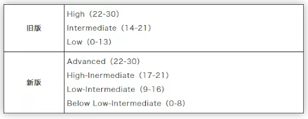 原先的口語分為四個等級:Good、Fair、Limited、Weak,而改革后分成了五等:Advanced(25-30)、High-intermediate(20-24)、Low-intermediate(16-19)、Basic(10-15)、Below-basic(0-9)。