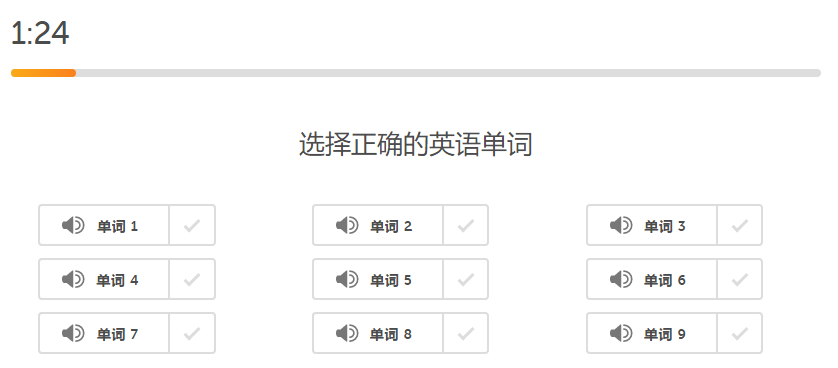 3. 選出正確的單詞,此題為兩種模式,一種是從一堆單詞中挑出正確拼寫;第二種是給出9個音頻聽,選出正確的讀音,要小心的是,如果選錯了還會倒扣分(注意:單詞的變化形態,警惕那些看著正確,但是差一,兩個字母之類的)