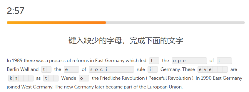 4. 補全單詞/完形填空,給出單詞的部分字母,補全缺失的部分,有的很簡單,有的徐要聯系上下文,利用完形填空的思路去做(建議:比較容易提高的題,多做題找感覺)