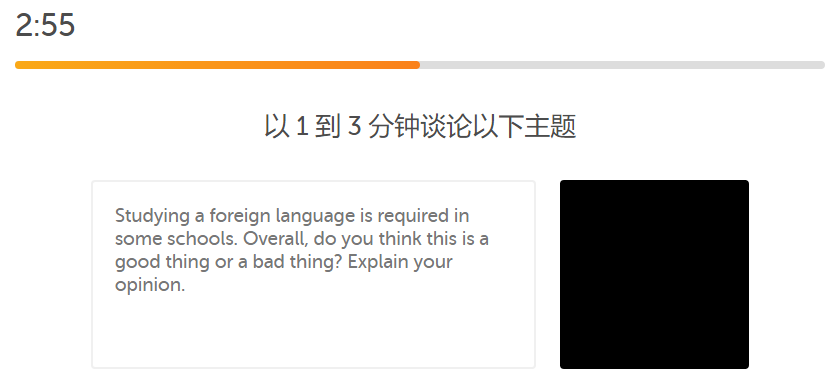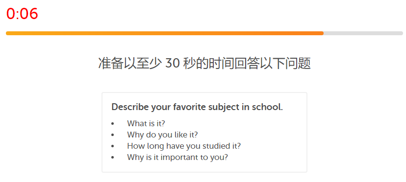 7. 小口語題,30秒的時間,根據主題和問題進行回答(建議:提前準備好一個喜歡的動物,科目等,其實跟托福/雅思差不多;回答上就一個問題一句話,但注意別超時)